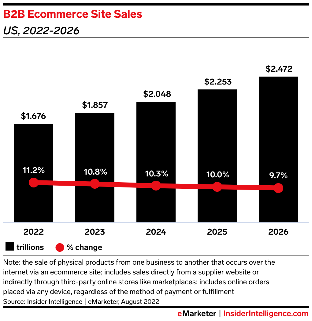US B2B ecommerce site sales will be $1.857 trillion this year, per our forecast, a 10.8% increase over last year. We expect double-digit growth will continue through 2025, before it slows slightly to 9.7% in 2026.