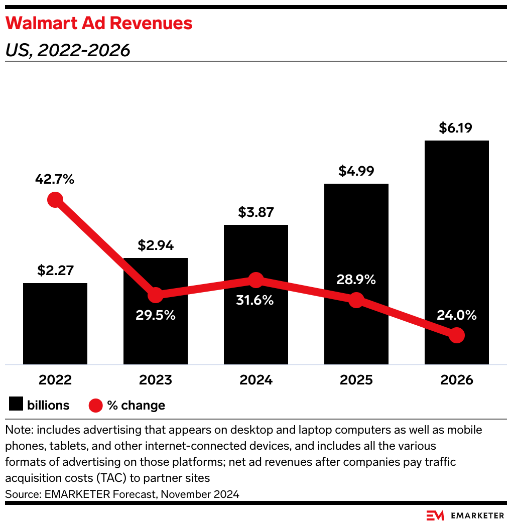 Our take: Even without Vizio, Walmart was already leveraging its considerable strengths—data from millions of shoppers and a massive physical presence—to rapidly grow its retail media business and gain ground against its chief competitor, Amazon. For example, nearly half (46%) of marketers have used Walmart Connect this year, up from just 24% in 2023, per Digiday.