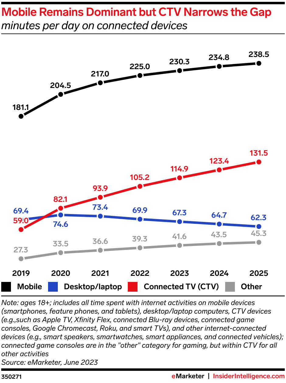 - People are spending more time streaming. We expect time spent with CTV among US adults to double from about 1 hour per day in 2019 to just over 2 hours per day in 2024. CTV usage also exceeds time spent on desktops and laptops. CTV will account for more than one-fourth of total time spent with digital media this year.