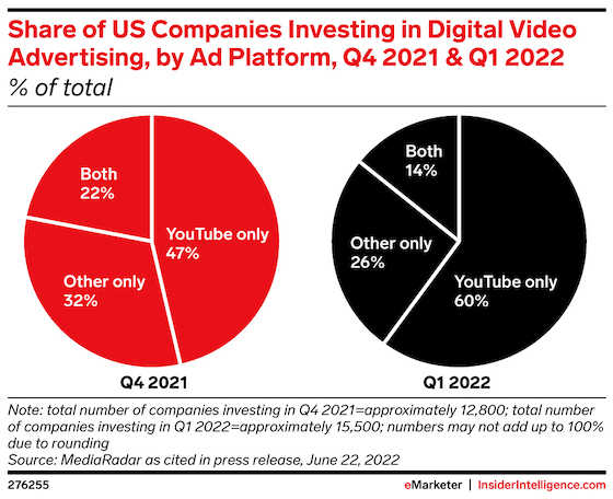 Among US companies investing in digital video advertising, the share that did so exclusively on YouTube increased from 47% in Q4 2021 to 60% in Q1 2022, for a total of roughly 9,300 companies in the US.
