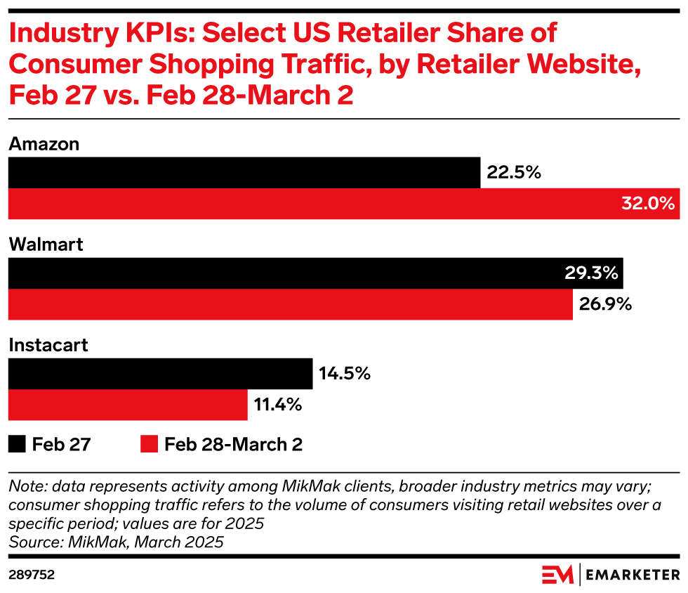 Amazon outperformed rivals during February 28 economic boycott: Industry KPI data shows Walmart's and Instacart's online traffic declined.