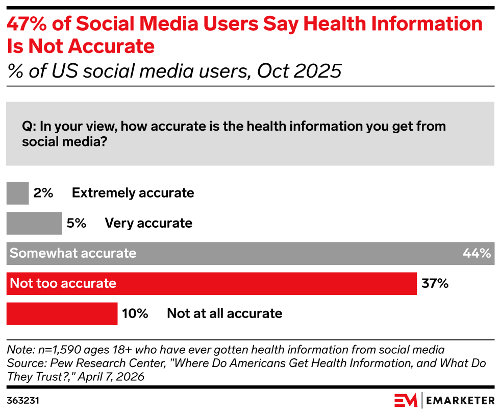 Only 7% of consumers rate social health information as highly accurate, raising the stakes for healthcare and pharma marketing content credibility.