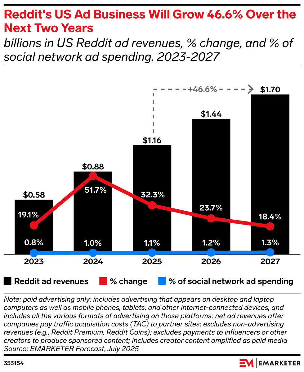 In an EMARKETER interview, Reddit COO Jen Wong shared optimism following the platform’s strong Q2, highlighting its focus on delivering ad outcomes over increasing ad load. Despite capturing just over 1% of US social ad spend, Reddit is growing ARPU through investments in machine learning, creative tools like Memorable AI, and advertiser infrastructure. Wong emphasized Reddit’s auction model supports full-funnel goals, while global expansion is underway through localized insights and self-serve adoption. She spotlighted Reddit Community Intelligence as a milestone, enabling brands to tap into decades of authentic discussion data. The company’s long-term bet: authenticity will outperform algorithms.
